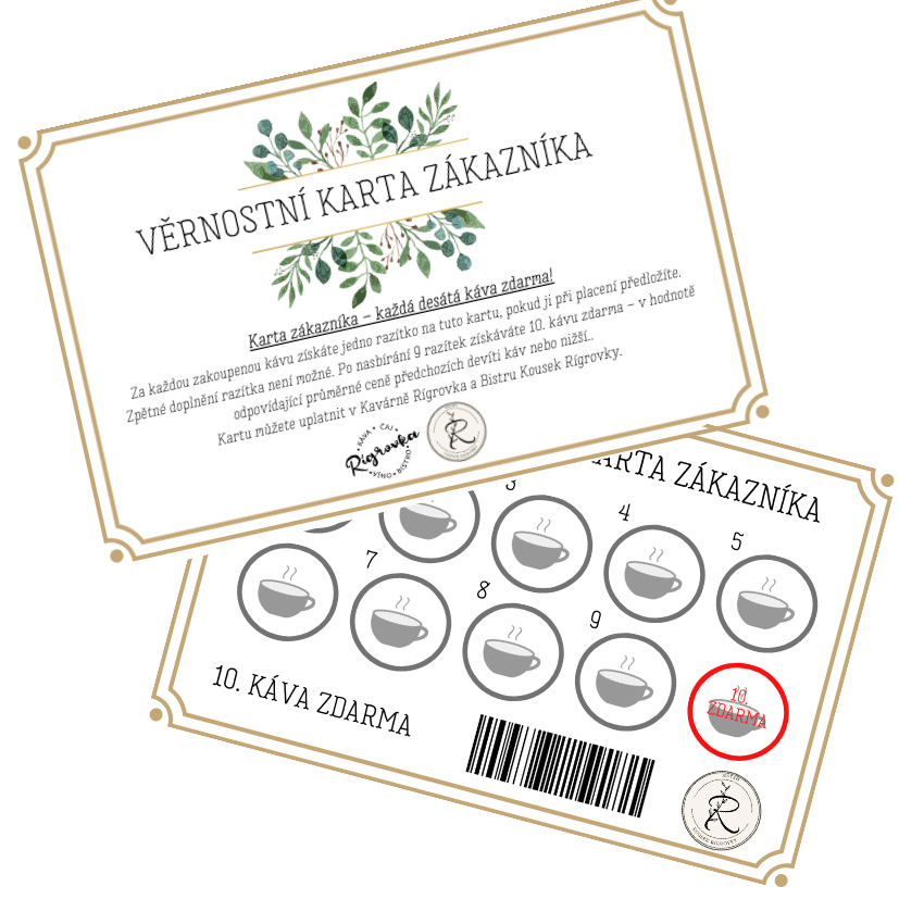 Věrnostní kartičku můžete uplatnit na obou našich provozovnách – v kavárně Rígrovka i v bistru Kousek Rígrovky na městském úřadě. Jedna kartička tak platí na dvou místech, kam si můžete odskočit na svou oblíbenou kávu.