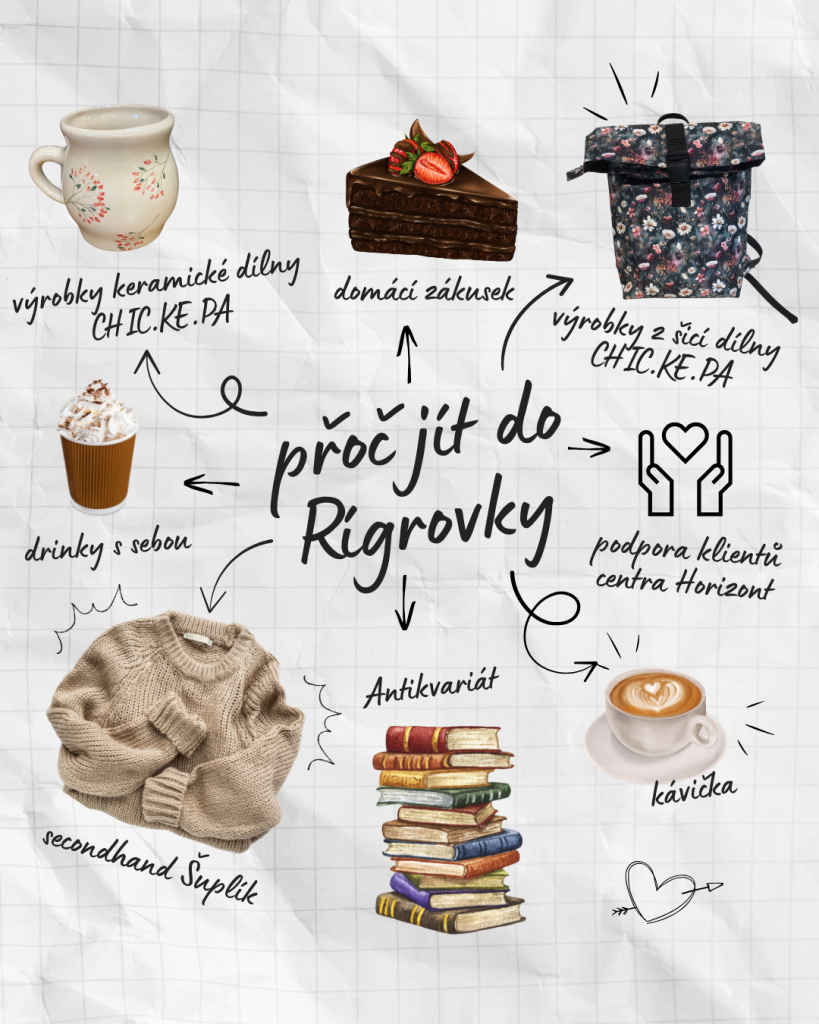 Rígrovka je také tréninková kavárna. Pravidelně k nám docházejí klienti z Centra Horizont, kteří si u nás procvičují pracovní a sociální dovednosti. Každou návštěvou tak podporujete jejich cestu k větší samostatnosti.